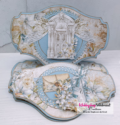 Voor de basis heb ik licht jeans linnenkarton gebruikt. Het dessinpapier is van Craft O'Clock (Vintage Sky). Ik heb eigenlijk 2 easelkaarten gemaakt. 1 keer met de grootste maat en 1 keer met de 1 na kleinste maat. De kleinste kaart heb ik op de ondergrond van de grootste kaart geplakt.